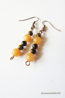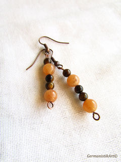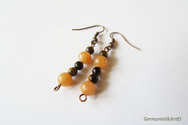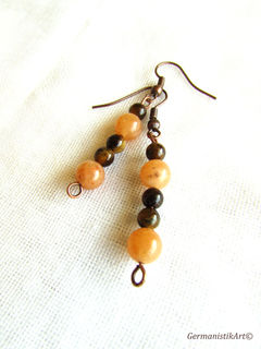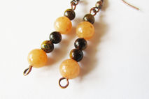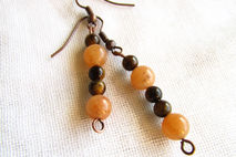 The dangle earrings are created from 4 mm tiger's eye beads and 6 mm red aventurine beads.