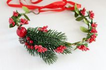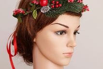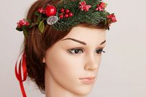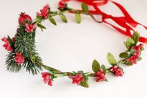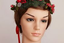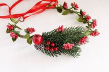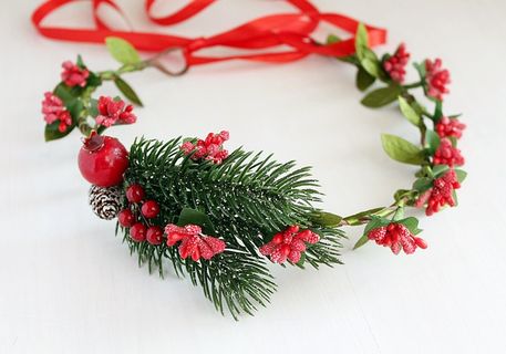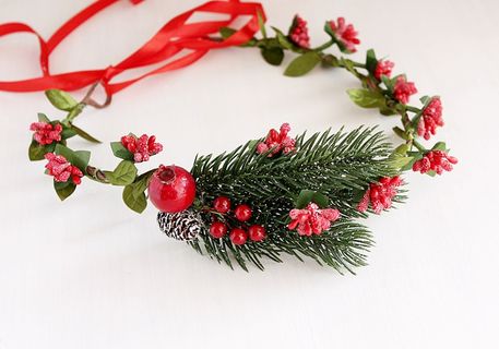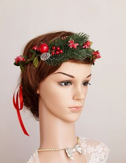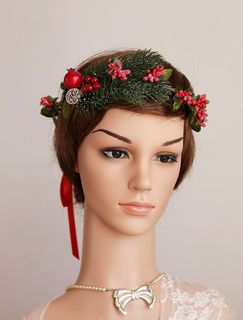 Ideal Christmas bridal hair crown, as a holiday hair garland, for woodland winter weddings. This red and green holiday halo is made of red holly berries, red pip berries, green pine sprig and green satin leaves, twined around vine wire base. The festive head wreath is adjustable. Red satin ribbon ties on the back to adjust and fit to any head size.