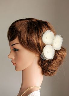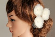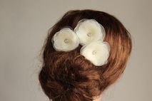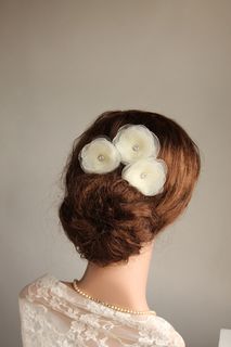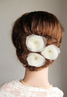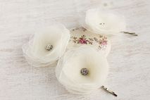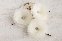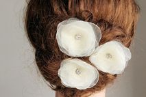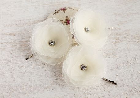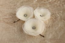 This listing is for THREE ivory flower bridal hair pins. I have made them of ivory silk organza and ivory crystal tulle. Each flower pin is adorned with small rhinestones in the middle. These wedding bobby pins are perfect hair accessory for brides, bridesmaids, flower girls, for romantic or whimsical weddings. Each flower has a silver premium quality bobby pin backing.