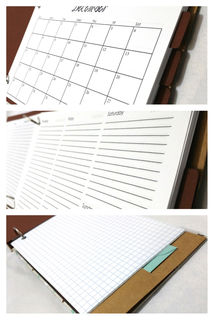 This notebook isn't just a notebook, it's everything you'll need to organize your life. It can be your journal, memo book, calendar, daily planner, organizer, sketchbook, or scrapbook. This design features a hard cover, bound with book rings so that you can expand, add, subtract pages to suit your needs. This is a sampler starter book that has a little bit of everything! And the great thing is, unlike other planners, this one doesn't expire in a year since the calendar (and all pages) can be easily removed and replaced. You can get smaller and larger book rings to suit your book's changing thickness as well.