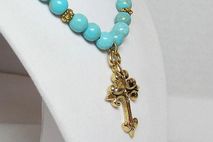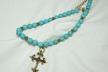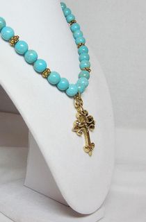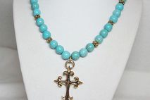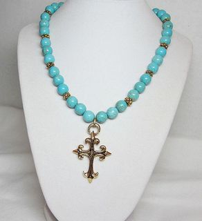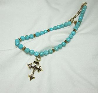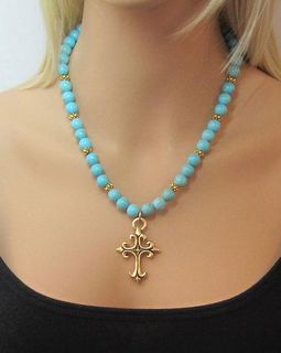 Beaded Gold Cross Necklace Turquoise Necklace 16" with 3" Extender Chain Statement Chunky Jewelry Womens Jewellery Cross hangs down approx. 2" from necklace Gold Plated Lobster clasp.
