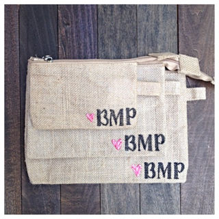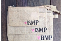 Thank your bridesmaids with a cute burlap gift set customized with there initials and a cute heart that matches your wedding or event!