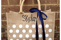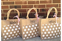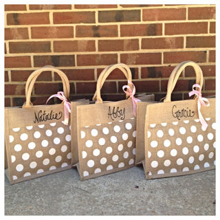 Thank your bridesmaids with a cute burlap tote customized with there name and a cute ribbon bow that matches your wedding or event!