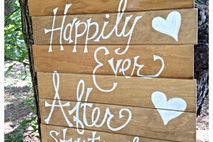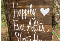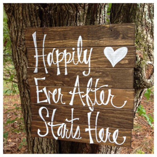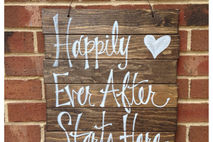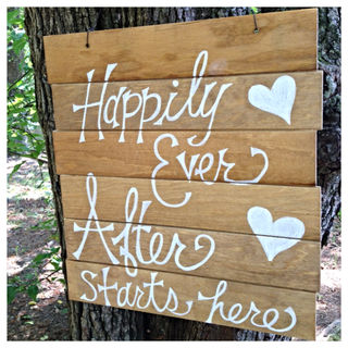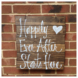 This pallet sign has the saying "happily ever after starts here" with cute hearts.