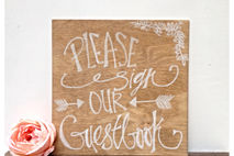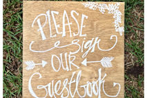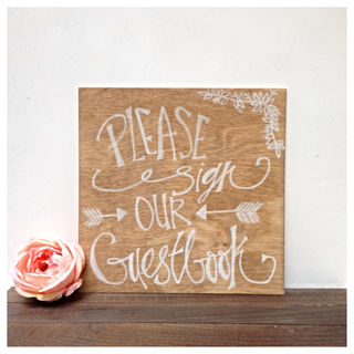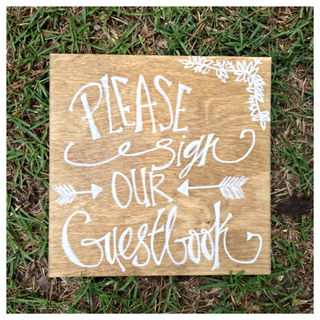 This rustic sign is hand painted and and customizable. "Please sign our guestbook"