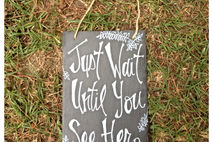 This is an adorable slate sign hand painted with "just wait until you see her"