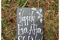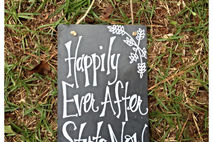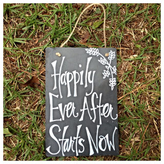 This is an adorable slate sign hand painted with "Happily Ever After Starts Now"