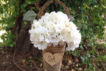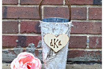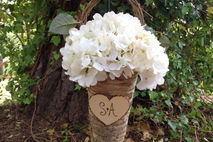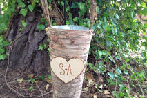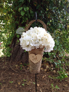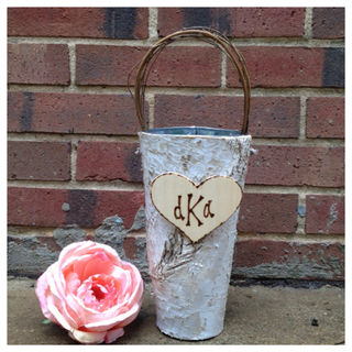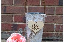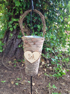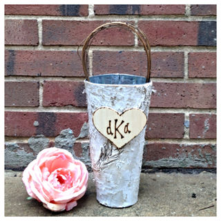 Hang these birch bark tin vases from the trees or shepherds hooks down your aisle.