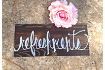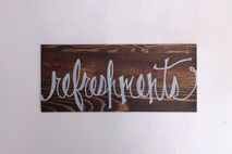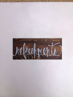 Hand painted white with the word refreshments to place at your drink station or bar.
