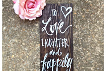 Hand painted white with the words love, laughter, happily ever after to place at your ceremony, tables or anywhere at your wedding.