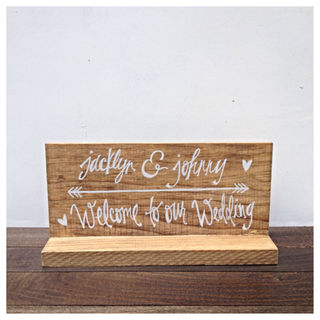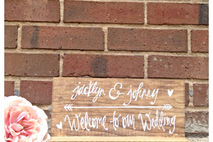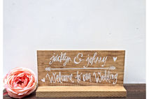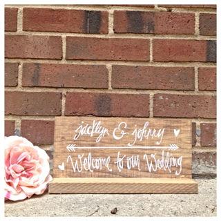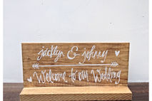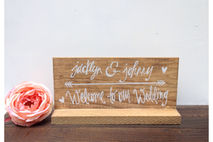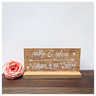 Stained wooden table top wedding "Bride and groom names - Welcome to our wedding " sign.