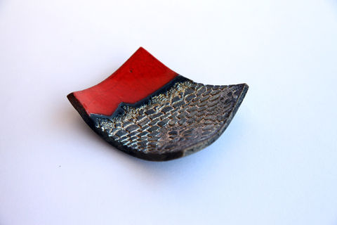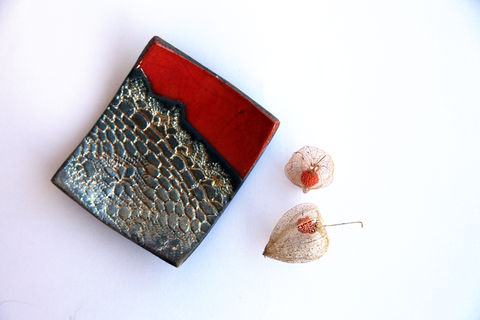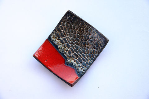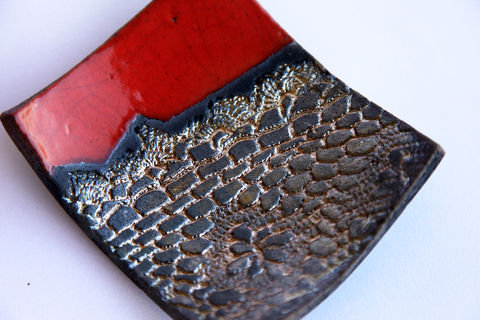 Raku pottery plate geometric with crochet pattern engraved. Gold and red dish ideal as ashtray, rings holder, home decor. Very elegant and unique. Every piece is handmade by me and it is one of a kind.