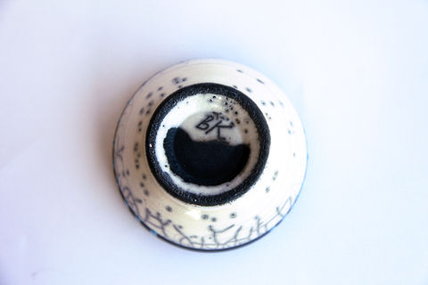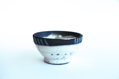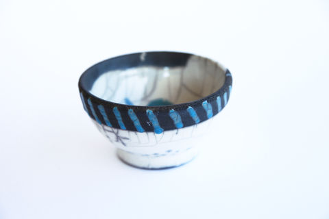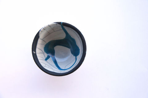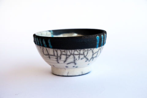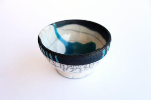 Craqueleur that is formed during the processing is the decorative feature of this technique ceramic and can never be replicated in an identical manner between one object and another, for this the Raku ceramic is unique and very valuable. To decorate this bowl I sprayed with the airbrush enamel turquoise and blue, to obtain an intermediate shade between the two colors. The outside instead I obtained by immersing the bowl in the intense blue color. Then I put it in the oven at 940°C, leaving the furnace was covered by sawdust for a few minutes and immersed in cold water to complete the reduction phase.