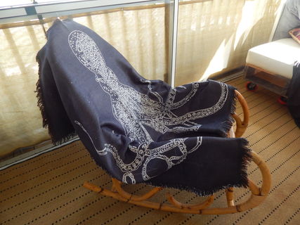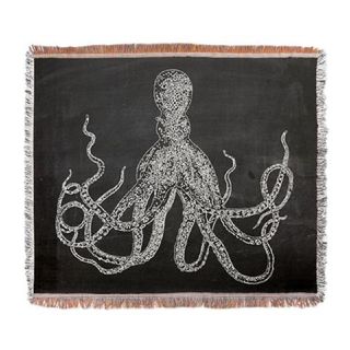 Vintage distressed look blockprint octopus design throw blanket tapestry. White design on black 'chalkboard' distressed look background. This is not a perfect black background. It has some distressing, lighter and darker marks, etc.