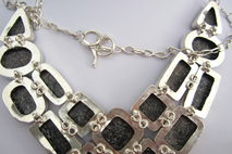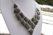 The four centre stones measure 2-1/2" from top to bottom. The stones from the very centre to the end of each side measures 4-1/2" in total length. The whole necklace measures 21" to 22" in length.