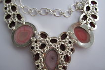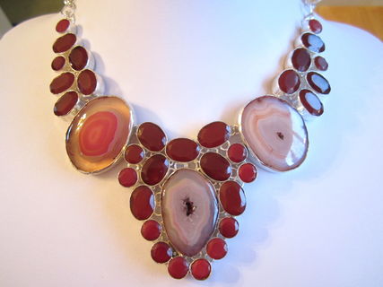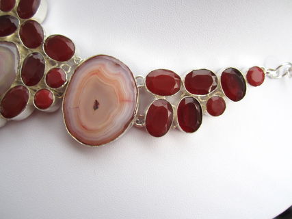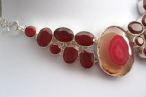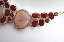 This necklace holds natural Earth-mined agate stones. They were cut in a way that you can see the core of each agate stone. You can see their orb or circular patterns. Very pretty! The rubies are lab created - otherwise it would cost wayyyyy too much (I can't believe how many sites sell these things as real Earth-mined rubies, sapphires, emeralds, etc.). When I hold this necklace, I feel energies of 'pick me up - of vitality!