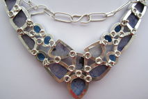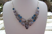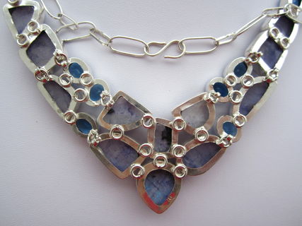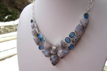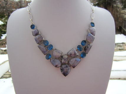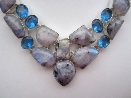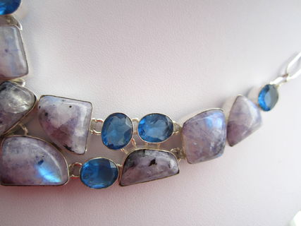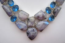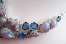This particular necklace holds natural moonstones that have been dyed purple. The colour is an interesting bluish purple! The stones themselves have that lovely flash that is so typical of moonstone! The blue quartz is lab created, obviously. All the stones have been nicely polished.