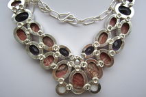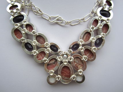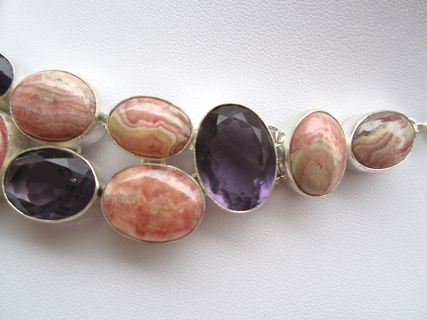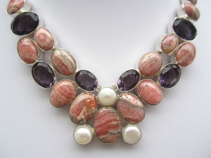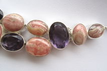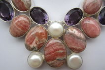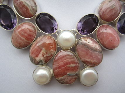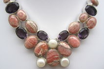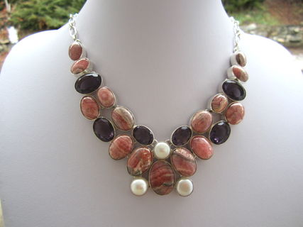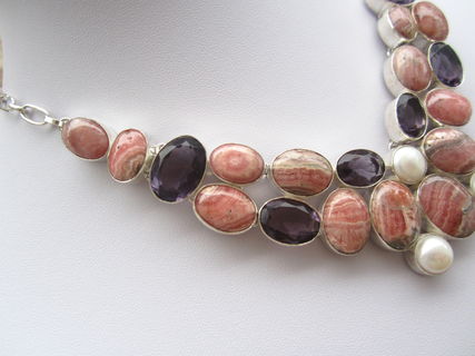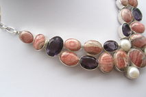 This particular necklace holds natural Earth-mined rhodochrosite crystal stones. It also contains amethyst (lab grown) and pearls (simulated). Rhodochrosite is a stone that integrates physical and spiritual energies, stimulating love and passion while energising the soul. Rhodochrosite opens the heart, lifting depression and encouraging a positive and cheerful outlook. It improves self-worth and soothes emotional stress. Rhodochrosite encourages a positive attitude, creativity and innovation, and enhances dream states.