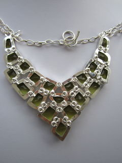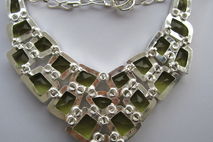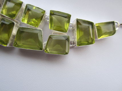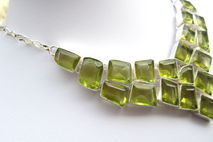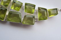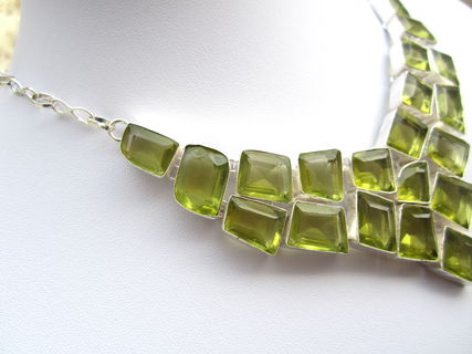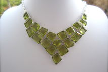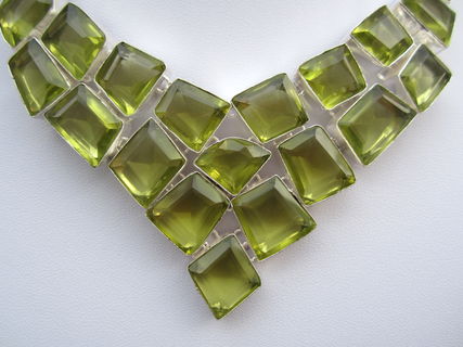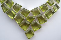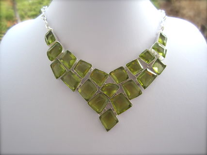 This particular necklace holds lab grown green yellow topaz crystal stones. The topaz are a greenish yellow colour. They are faceted and beautifully polished.