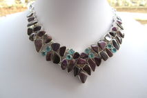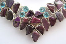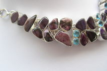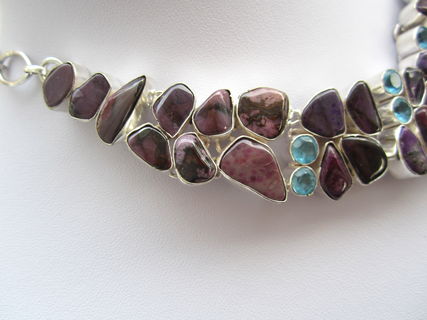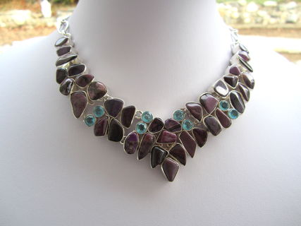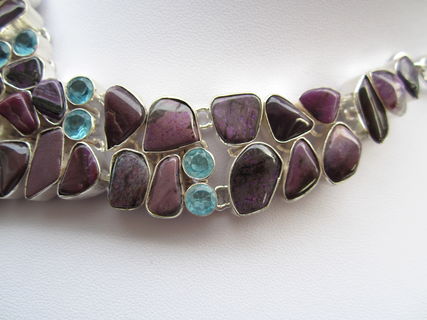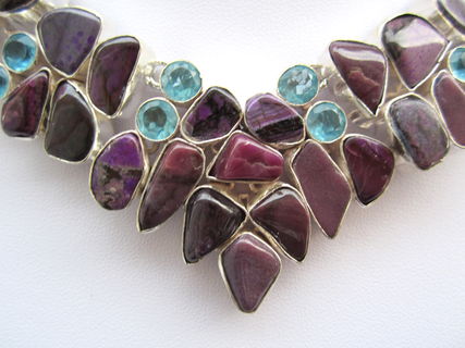 This particular necklace holds gorgeous natural sugilite crystal stones. It also has 8 smaller round blue topaz crystal stones. All stones are beautifully polished. This necklace has a 'master' power about it!