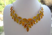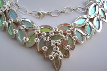 The center stones measure 2-1/4" long from top of necklace to bottom point. It measures 4-1/4" from center to end of each side of necklace.