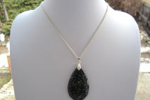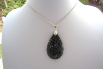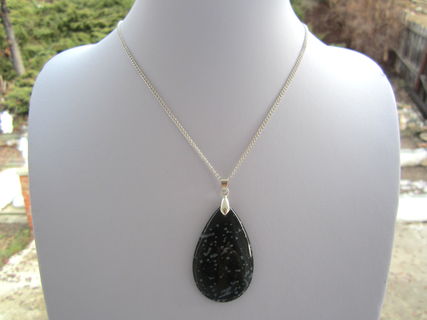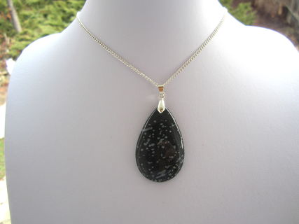 This is a pendant that holds a polished snowflake crystal stone. Snowflake obsidian is black with white spots. Kinda polka dot. It has a brass silver finish pendant bail on it so you can hang it on a chain - which allows for a more inexpensive option for you.