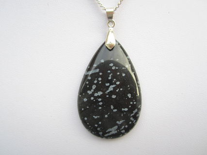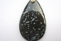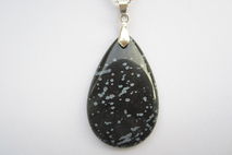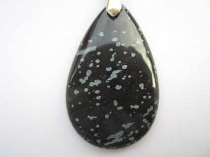 This snowflake obsidian pendant measures 2-3/8" long, including bail, and is 1-1/4" wide.