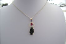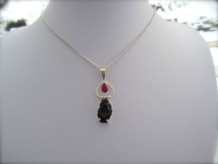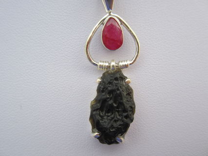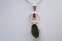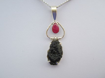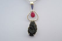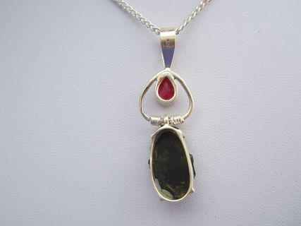 This is a pretty pendant. It has a ruby crystal teardrop shape stone on the top. The somewhat oval center crystal is a natural tektite crystal. It is in its natural state. It is set in sterling silver.