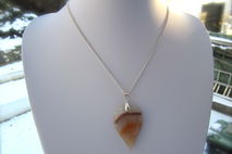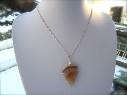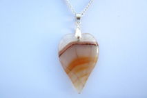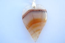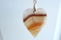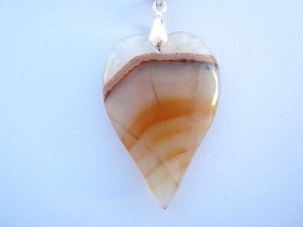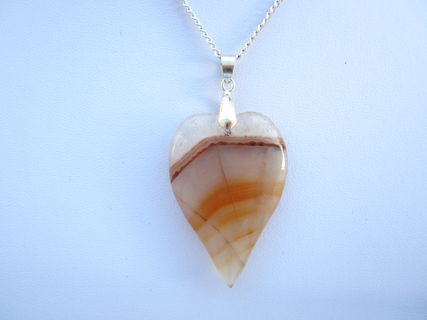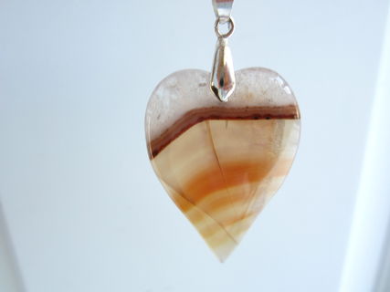 This is a pendant that holds a lovely, polished peach, orange, brown clear agate stone. It has been carved into a heart shape. It is also nicely polished. It has a brass silver finish pendant bail on it so you can hang it on a chain - which allows for a more inexpensive option for you.