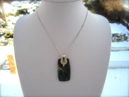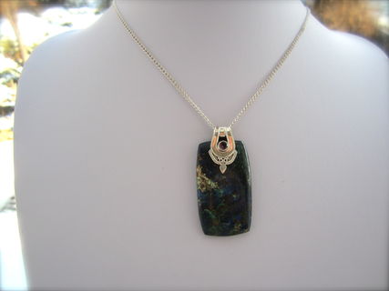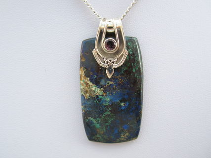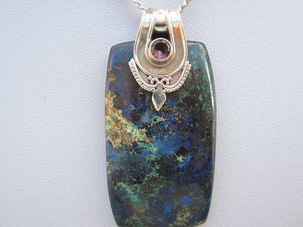This is a pendant that holds a lovely deep blue azurite and malachite crystal stone. It is set in sterling silver. The silver is ornate and holds a round amethyst crystal stone within it. Such a gorgeous pendant!