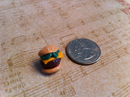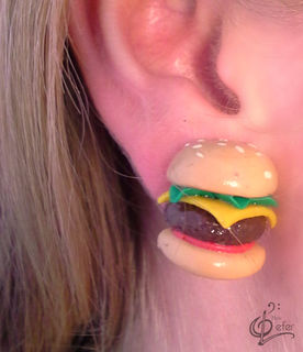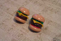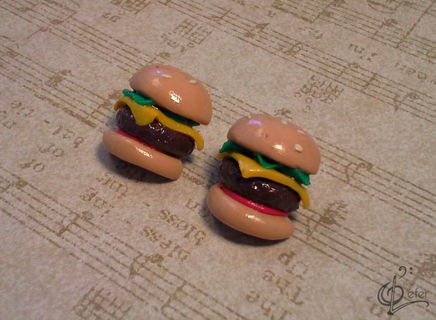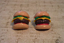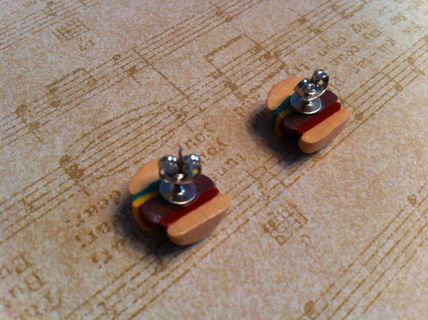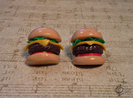 With the Fourth of July barbecues right around the corner these cheeseburger studs are the perfect accessory! Or simply a goofy fun addition to your collection. The stud posts have been connected by super strong glue to a pair of hand sculpted cheeseburgers.