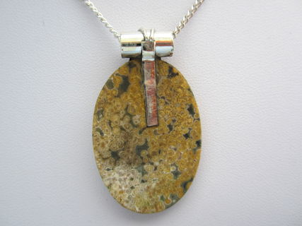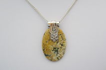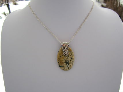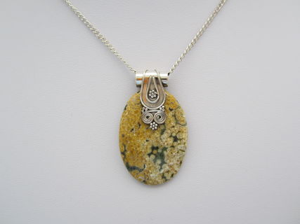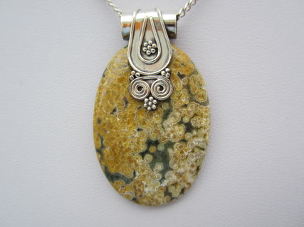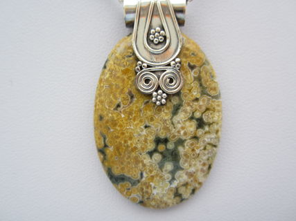This gorgeous pendant holds a natural ocean jasper with lovely orb patterns! It is set in stamped .925 sterling silver and its bail is lovely and ornate!