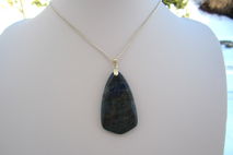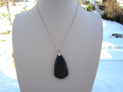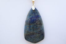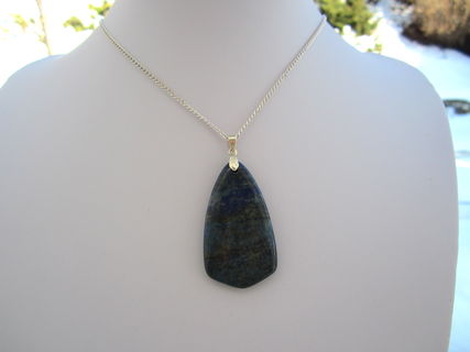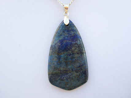 The main stone in this pendant is lapis lazuli. It is nicely polished. It has a brass silver finish pendant bail on it so you can hang it on a chain - which allows for a more inexpensive option for you.
