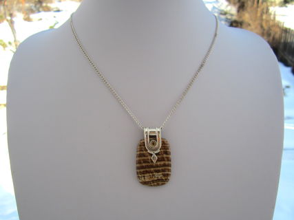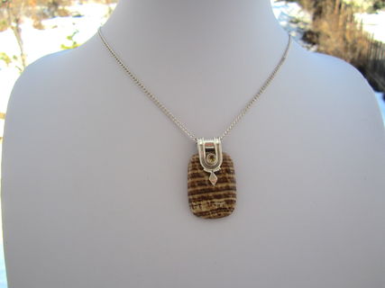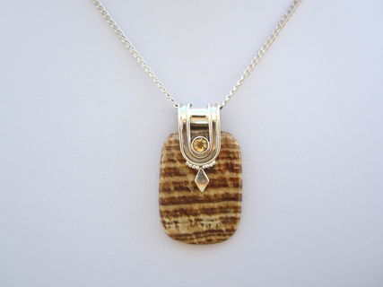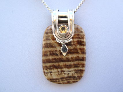 This is a natural brown aragonite stone crystal set in stamped 925 sterling silver. It also holds a round polished citrine.