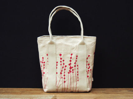 The outer is made from natural colour 100% hemp canvas, hand screen printed with our Baubles in the Breeze design in red. There is an outside slip pocket.