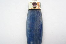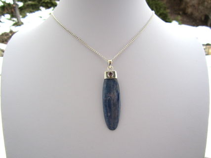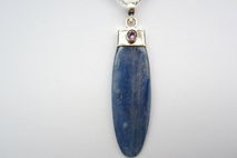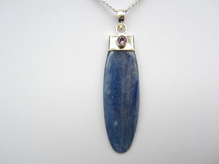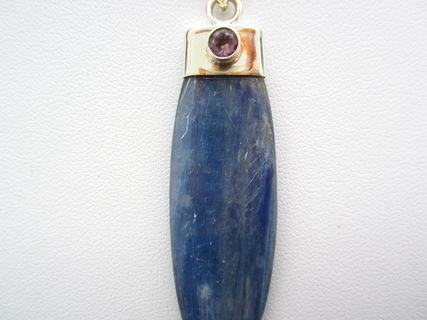 This pendant holds a genuine blue kyanite tear shaped stone. It is nicely polished. It also sparkles and shines from its own beauty. The pendant also includes a round amethyst quartz stone. The stones are set in sterling silver.