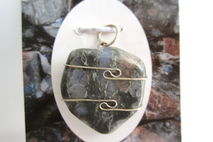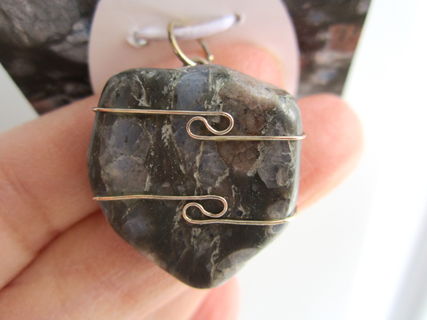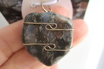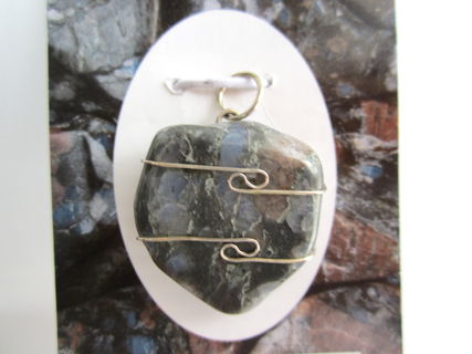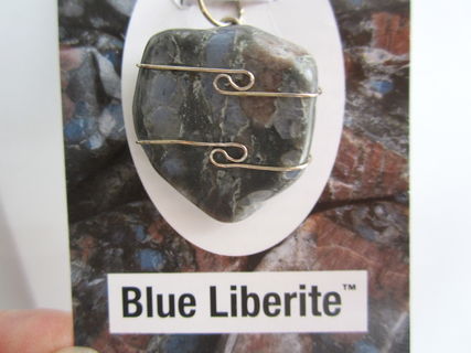 This is a blue liberite crystal pendant. Liberite contains feldspar, magnetite, iron oxide, clinozoisite and leucozene. It is a jasper found only in New Zealand. It has gorgeous swirls of browns. Just beautiful! The stone is also nicely polished. It is wrapped with sterling silver wire.