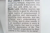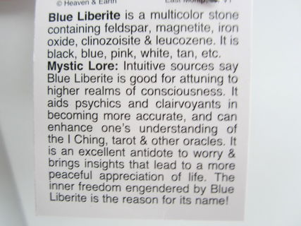 Metaphysically speaking, blue liberite is an ideal ally for attuning to higher realms of consciousness, and for bringing the energies and messages of those domains into one’s awareness. It also has capacity to lift us up. These stones remind one that the Universe is perfect, and oneself as well! They help uplift one’s mood and set the wheels of optimism rolling. In fact, the sense of inner freedom engendered by blue liberite is the reason for its name!