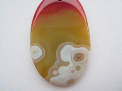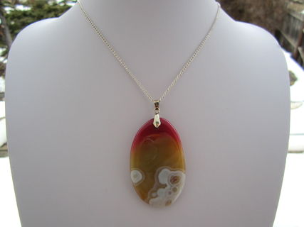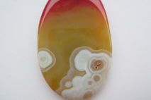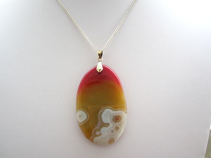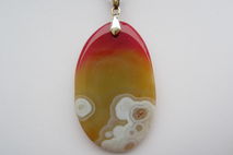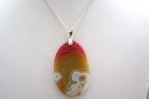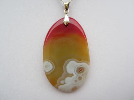 This is a pendant that holds a lovely, polished multi-color agate stone. It has lovely orbs patterns in it! It has a brass silver finish pendant bail on it so you can hang it on a chain - which allows for a more inexpensive option for you.