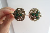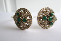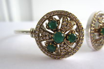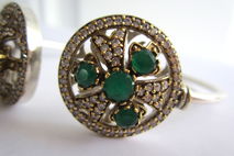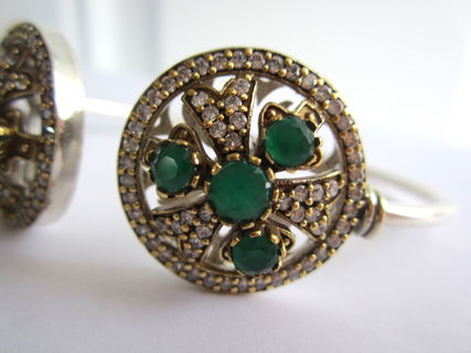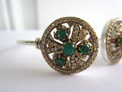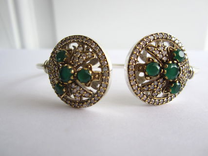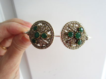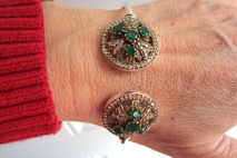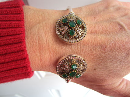 This particular bracelet holds lovely natural Indian emerald and topaz gemstones. The emeralds are Earth mined but have been dyed to be a uniform colour. The bracelet is just gorgeous! It sparkles and shines! The gold colour around the stones is bronze. It is set in sterling silver plating!