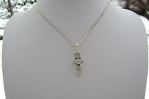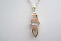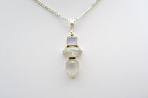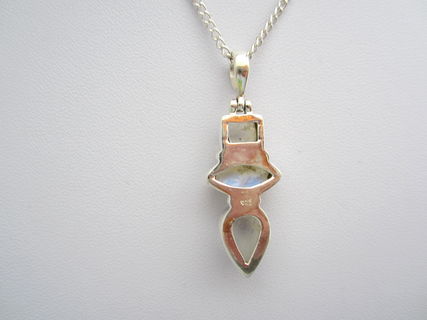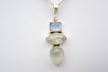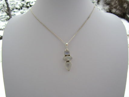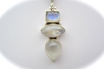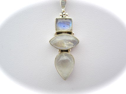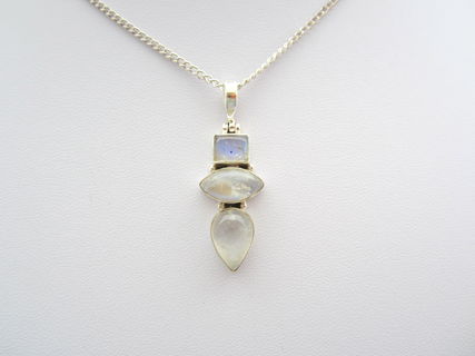 This pendant holds 3 natural moonstone crystal stones. All three have that gorgeous blue flash to it, typical of moonstone, though it appears only one does in the pics. The stones are all nicely polished. The pendant is set in sterling silver.