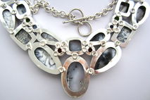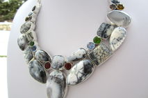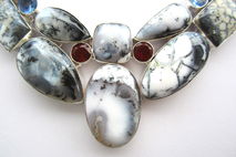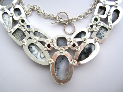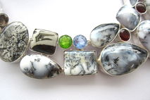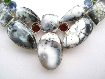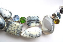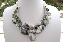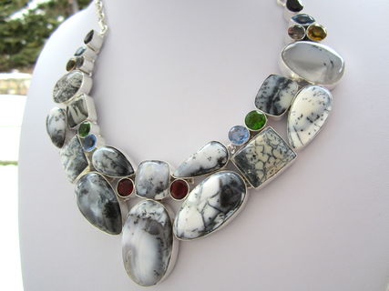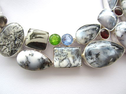 This necklace holds natural Earth-mined merlinite crystal stones. Merlinite is also called dendritic agate or dendritic opal. The stones are all nicely polished. Very pretty! The gemstones are colour treated glass, just so you be aware. When I hold this necklace, I feel energies that are very soothing and peaceful.