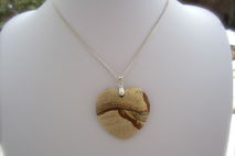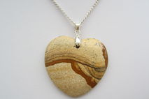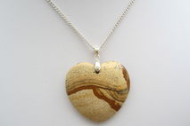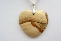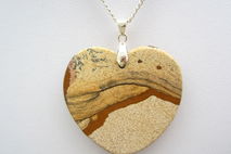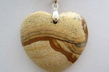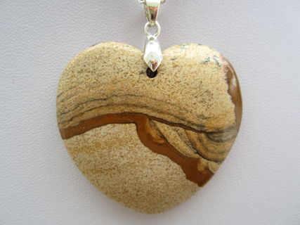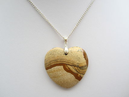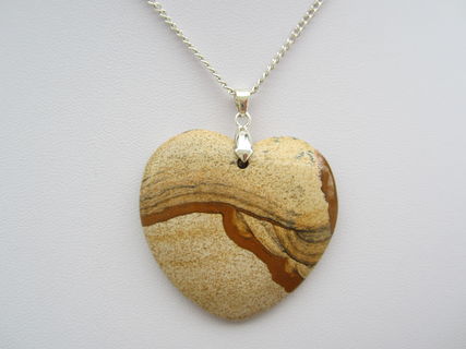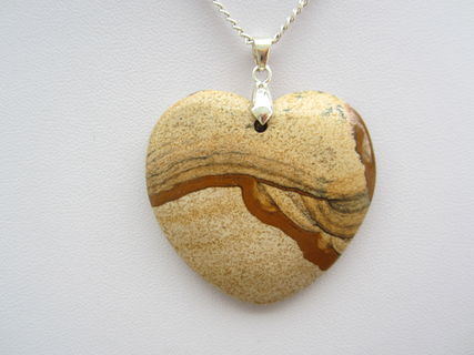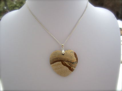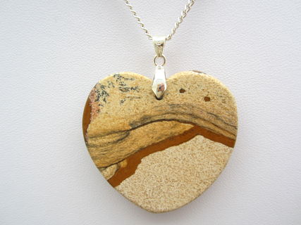 This is a pendant that holds a lovely, polished picture jasper stone. It is heart shaped. It has a brass silver finish pendant bail on it so you can hang it on a chain - which allows for a more inexpensive option for you.