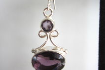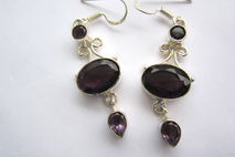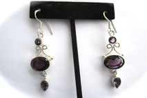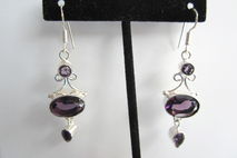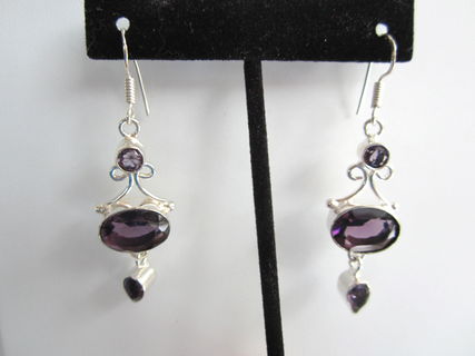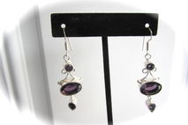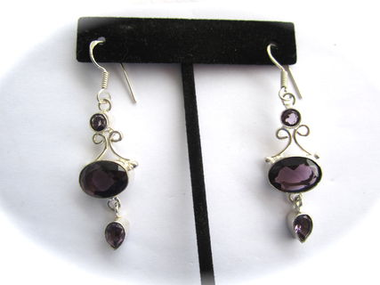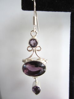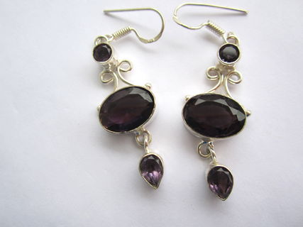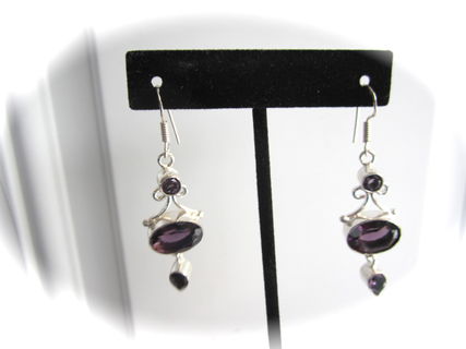 This is a lovely pair of lab grown amethyst earrings. There are three stones for each earring. They have been nicely polished and faceted so they catch the light. The earrings are set in sterling silver