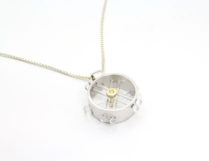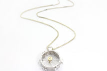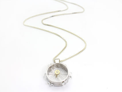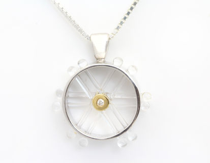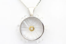 This pendant is made of rhodium plated sterling silver. It has clear glass rods riveted through it with a .02ct diamond flush set in a 14k plate. Each pendant comes on an 18" diamond cut box chain. Pendant is approximately 3/4" W x 1" T x 1/2" D.
