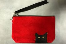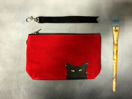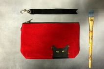 Original handpainted handbag design by artist Rebekah Lazaridis. Snarky hunting black cat with peering golden eyes hand painted on cherry red suede leather.