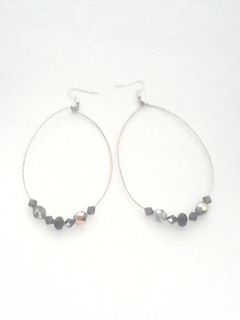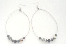 Silver earrings shaped like dew drops with black and silver iridescent crystal beads.
