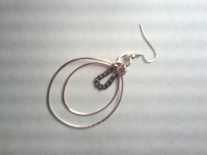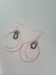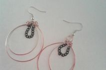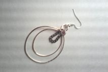 Rose gold double hoop earrings with black chain accent.