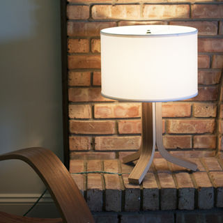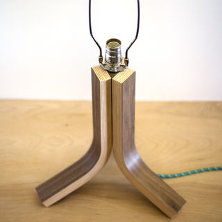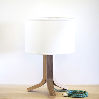 Hand-layered bent plywood with real walnut wood veneer, hand sanded and finished with a whey-based poly for durability. Finishing touches include nickel-plated lamp hardware with on/off toggle, white linen drum shade, and colored cloth cord.