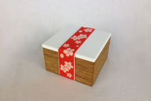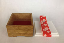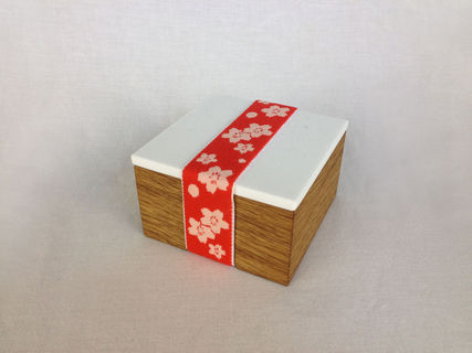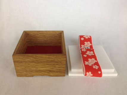 Oak Wood with Corian lid, felt bottom, and elastic strap.